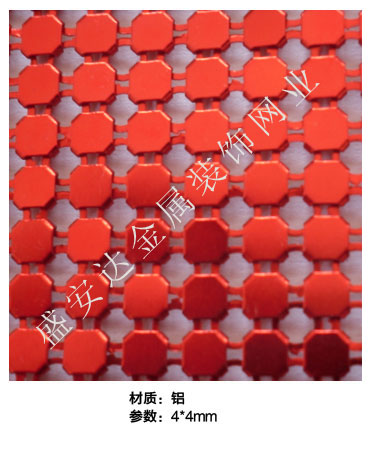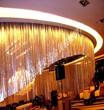金屬布簾----是多個鋁網片結合而成,網片主要樣式有平面,圓珠,梅花和鉆石等形狀,廣泛用于酒店,咖啡廳,音樂廳,賓館等屏風割斷吊頂等,也可用于櫥窗裝飾,它有著極強的裝飾效果,金屬質感的鱗片可以像布一樣可以隨意變動,在光影變幻之下,顯示出迷人的斑斕色彩,是最新的流行時尚元素之一。